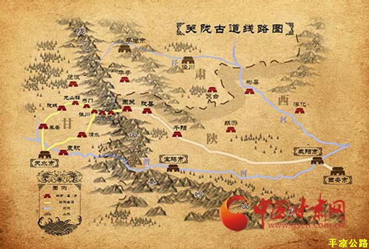 陇坻道另有一条,从长安起,过雍(凤翔),沿千水河谷西北行,经上关(华亭)、阳城(山峡)、番须(华亭西北部),翻越小陇山,再经古略阳城一线西出抵庄浪、秦安、天水。我们本次考察的路线,基本上走这条。