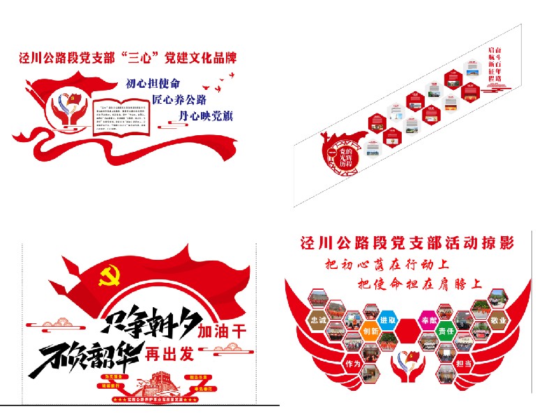 1.打造一条党建文化长廊。围绕“三心”主题,以“初心担使命、匠心养公路、丹心映党旗”为总纲,按照“一名党员一面旗帜,一个支部一座堡垒”标准,选取中国共产党建党以来的特殊历史节点,全景展现党的光辉历程,体现“奋斗百年路,启航新征程”主旨;制作增强“四个意识”、坚定“四个自信”、做到“两个维护”、领悟“两个确立”展板,潜移默化,提高全体干部职工的政治意识和政治站位;以党员“三亮三比”“四讲四干”为抓手,大力弘扬社会主义核心价值观,全面打造党建文化长廊。