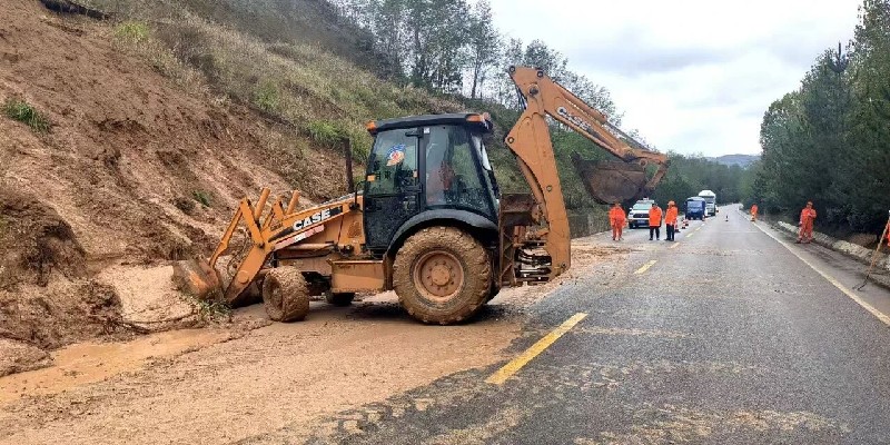 闻“汛”而动,应急响应“零延迟”。强降雨导致G244线部分路段边坡土石滑落、淤泥堆积,严重威胁道路通行安全。该段第一时间启动应急预案,迅速调集挖掘机、装载机、运输车辆等设备,组织养护人员冒雨赶赴现场,立即开展清淤排险作业。