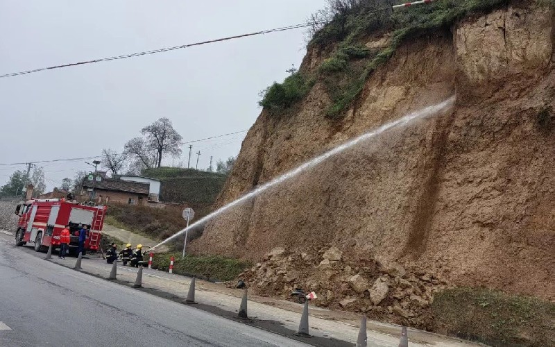 险情棘手,创新协作定方案。面对高悬且土质松软的大体量土块,若采用常规机械或人工清理,极易引发二次塌方,直接威胁作业人员安全。灵台公路段迅速研判现场情况,立即与县消防救援大队会商,共同制定处置方案。最终确定采取“水枪卸载、机械助力”的联合处置方式,为高效排险打下坚实基础。